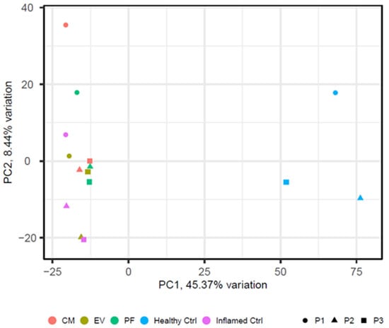 Principal Component Analysis (PCA) plot displaying the differential gene expression data from patient cells. Three patients (P1, P2, and P3) are represented by different symbols, while the treatments and controls are distinguished by different colors. The healthy control (light blue) is separated from the other samples. Cells treated with CM (red dots), inflamed control (purple dots), EV-treated cells (green dots), and PF-treated cells (light green dots) cluster close to each other.