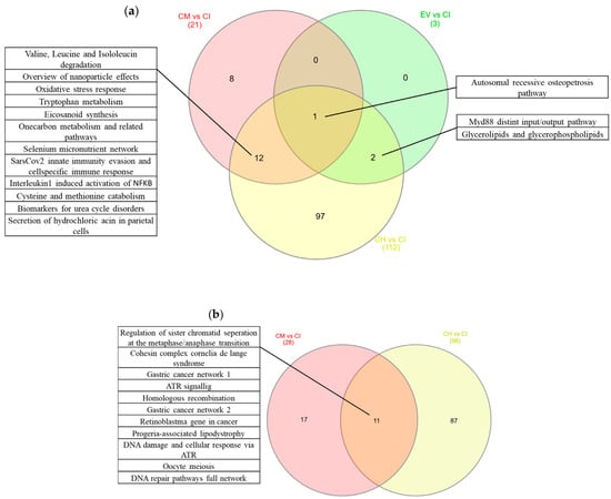 In contrast, EV treatment upregulated no pathway and downregulated 3, of which 2 pathways (67%) were shared between EV treatment and the healthy control group and 1 (33%) with both the CM treatment and the healthy control group (Figure 6a and Table 4).