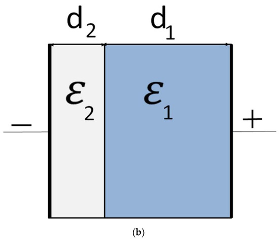 Several authors reported general theoretical models of the interfaces between conductors and electrolytes. Among the most prominent of these models is Parallel-Plate Condenser Helmholtz Model [19,20]. The main conclusion of this model is that the capacitance of an interface between a conductor and an electrolyte is primarily determined by a thin layer of molecular ions at this interface (Helmholtz layer) and that this capacitance can be estimated by using the formula for a planar parallel plate capacitor with a dielectric constant of this electrolyte [19,20]. Despite many theoretical advances, this conclusion, first suggested in 1853, is still a cornerstone of the presently used theories. Among the most important later-developed theories are Diffuse-Layer Model by Gouy and Chapman [19,20]. This model is based on the solution of the Poisson–Boltzmann equation that accounts for electric field screening by the electrolyte ions affected by their thermal motion and predicts the formation of a diffuse layer. A historical review of other important models can be found in [19,20]. For this paper, we summarize that in the presently used general theoretical models of the double-layer capacitance, the diffuse layer is positioned between the Helmholtz layer and the bulk of the electrolyte and capacitances of both layers are usually calculated by using two different dielectric constants for these layers [19]. The dielectric constant of the Helmholtz layer, that in some cases is divided by inner and outer Helmholtz planes, is usually considered to be smaller than the dielectric constant of the diffuse layer [21].