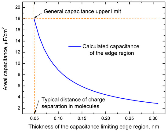 Several authors [12,19,20,21] estimate areal double layer capacitance at the interface between conducting electrode and electrolytes by using the formula for a planar parallel plate capacitor Cdl = ε0ε/t, where ε0 = 8.85 × 10−12 F/m, ε is the dielectric constant (relative permittivity) of the electrolyte, and t is the distance between plates. This formula assumes that edge effects at the interfaces of conducting electrodes and the dielectric material in capacitors can be neglected. This assumption is valid for most cases where capacitance values are not too high. However, for high enough capacitance, the edge effects related to an edge region without charge transfer and accumulation, with negligible conductivity, and electric susceptibility separating the conducting electrode from the charge accumulation region in non-faradaic capacitors may be necessary. This edge region can be empty or contain nanostructures other than polarized molecules or mobile charge carriers (ions or others). We will refer to this region as a capacitance-limiting edge or edge region. The existence of this region assumes that positive and negative charges at the interface between the electrode and charge accumulation region are separated by a distance that cannot be shorter than half of the typical length of the carbon-hydrogen bond and, in the absence of charge transfer through this interface in non-faradaic capacitors. Inside this region, charge accumulation does not occur, and the electric susceptibility is negligible. (According to the parallel plate capacitance model, the charge accumulation happens at the boundaries of this region). Figure 1a shows a schematic picture of a capacitor formed in water between graphene and gold gate electrode, illustrating this model in the graphene/water interface case. As one can see from this figure, the areal capacitances of the charge accumulation layer (Cca) and the edge region (Ce) are connected in series and 1/Cdl = 1/Cca + 1/Ce. In theoretical studies, the inner Helmholtz plane (IHP) is often used [19,20,21]. This plane passes through the centers of the ions (see Figure 1a). We do not use this plane as a boundary of the edge region (see Figure 1a) because ions and dipoles have finite sizes. In our model, there must be no partial ionic or dipole charge density penetration inside the edge region to ensure that the electric susceptibility inside it is negligible. Dependence of Ce for the edge region with the relative permittivity, ε2 ≈ 1 on its thickness (d2) (see Figure 1a,b) is calculated by the parallel plate capacitor formula, Ce ≈ ε0/d2 (see the result of these calculations in Figure 2). Considering that d2 can unlikely be shorter than half of the typical length of a carbon-hydrogen bond (about 0.05 nm) from Figure 2, one can see that this smallest possible thickness of the edge layer corresponds to Ce ≈ 18 µF/cm2. The capacitance of the edge region is connected in series with other capacitances that determine Cdl, and this value of Ce can be used as an upper limit for Cdl reached at d2 ≈ 0.05 nm.