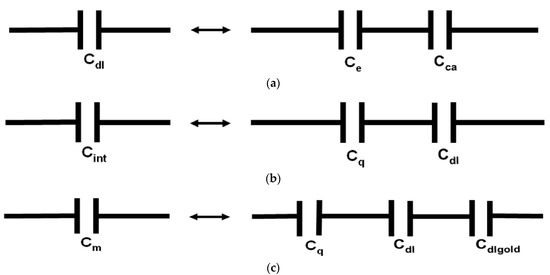 Graphene quantum capacitances were obtained using five different Cdl values, and the capacitance was measured between six gold wire gate electrodes and graphene in water at a frequency of 0.1 Hz.
