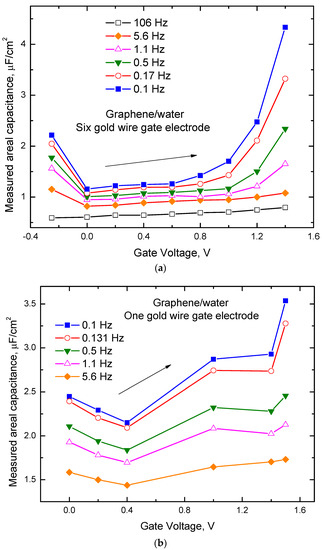 The interfacial capacitance at the graphene/water interface (Cint) is determined by connected in series Cdl and Cq (see Figure 3b) [1,12,13,14,15,16,17], where, Cint, Cdl, and Cq are normalized by graphene electrode surface area (Sgraphene). The capacitance measured between graphene and the gold gate electrode is determined by connected in series Cint and Cdlgold (see Figure 3c), where Cdlgold is the double layer capacitance at the interface between water and gold gate electrode normalized by the gold gate electrode true surface area (Sgold). Figure 4a,b shows the typical capacitances (Cm) measured at different frequencies between graphene and two different types of gate electrodes in water. We are primarily interested in electrostatic values of the capacitances, and therefore, we focus our analysis on the experimental data obtained at the lowest frequencies (0.1 Hz). One can see from Figure 4a,b that at these frequencies for both types of gate electrodes, capacitance dependence on the gate voltage demonstrates a minimum. We identify the observed minimum in capacitance as corresponding to the Dirac point, similar to the conclusions of the work [12]. For both types of gate electrodes, capacitance increases with the gate voltage shifting away from the Dirac point. Considering known Cq dependence on the gate voltage [12] and assuming the usually weak dependence of the double-layer capacitance on the gate voltage, we conclude that in the studied gate voltage range Cq plays a significant role in the interfacial capacitance for both types of the used gate electrodes. One can also see from Figure 4a,b that the dependence of Cm on the gate voltage is stronger for the gate electrode with a higher surface area. This behavior can be explained by the fact that for the gold gate electrode with higher surface area Cdlgold is also higher in comparison with Cq, and because these capacitances connected in series Cq for this type of gate electrode plays a more critical role in the dependence of Cm on the gate voltage.