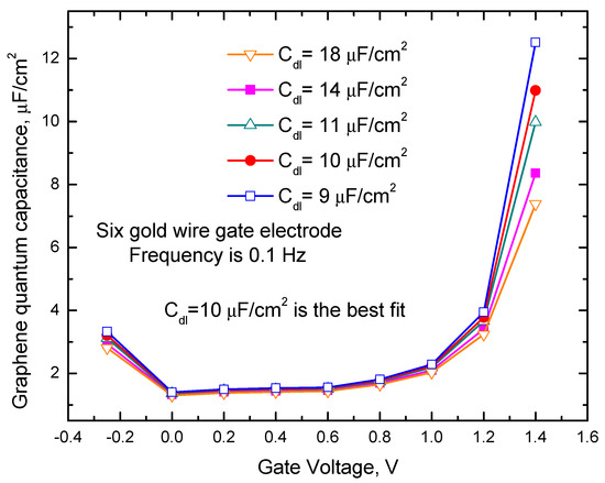 From Figure 4a one can also see that Cm slope versus gate voltage increase with the gate voltage increase. The maximal slope of the measured capacitance versus gate voltage is about 10 µF/(cm2V). This slope is also about two times less than the slope predicted for quantum capacitance by the formula Cq ≈ (2 e3 Vch)/(π ћ2 νF2) [12], where ћ is Planck constant, e is an electron charge, νF ≈ c/300 is the Fermi velocity of the Dirac electrons, and Vch is the potential of graphene. Considering schematic pictures in Figure 3a–c quantum capacitance value can be calculated from the equation 1/(Cm Sgraphene) = 1/(Cq Sgraphene) + 1/(Cdl Sgraphene) + 1/(Cdlgold Sgold). Results of these calculations for the sample with the gate electrode containing six gold wires (see the data presented in Figure 4a) with different Cdl values are shown in Figure 5. In these calculations, it was assumed that the roughness of our gold gate electrodes and the electrode of the capacitors studied in [27] are about the same and using their capacitance measurement results, we take CdlgoldSgold ≈ 40 µF/cm2 Sgoldnom, where. 40 µF/cm2 is the average capacitance value reported for gold electrodes at 0.1 Hz frequency in [27], and Sgoldnom is the nominal surface area of the capacitor electrode.