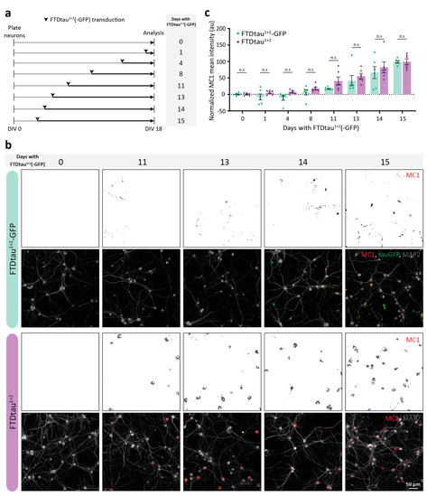 FTDtau1+2-GFP and FTDtau1+2 pathology progresses with similar kinetics. (a) Schematic representation of the experimental set-up to assess the progression of tau pathology in the FTDtau1+2-GFP and FTDtau1+2 models. Experiment duration (plating and fixation days) was the same as the regular protocol (Figure 1a), whereas the time point for lentiviral transduction changed, resulting in different exposure durations per condition. (b) Representative epifluorescence images for selected time points. Immunofluorescence was performed for the neuron-specific dendritic markers MAP2 (grey) and MC1 (red). In FTDtau1+2-GFP condition, tau’s fluorescent signal is shown in green. Separate channels are shown in grayscale. (c) Quantitative high-content automated microscopy analysis of the mean MC1 immunofluorescence intensity for FTDtau1+2-GFP and FTDtau1+2 models per time point, relative to 15 days of exposure (100%). N = 3 independent experiments, n = 6 observations per time point. Data points represent the corrected mean value per well. Error bars represent the SEM. n.s. = not significant, nested t-test for comparison between models per time point.