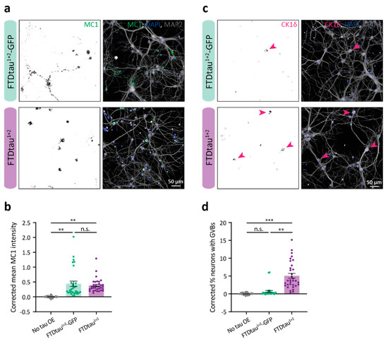 FTDtau1+2 is associated with a higher GVB load than FTDtau1+2-GFP. (a,c) Representative epifluorescence images for MC1-positive tau accumulation (a) and GVBs (c) in primary neuron cultures transduced with either FTDtau1+2-GFP and FTDtau1+2 following the general protocol (Figure 1a). Arrowheads point at neurons with CK1δ-positive GVBs. Separate channels are shown in grayscale. (b,d) Quantitative high-content automated microscopy analysis of tau pathology parameters represented in (a,c). A condition that was not transduced with a tau-overexpressing virus was included as control. N = 8 independent experiments. Data points represent corrected values per well, and error bars represent the SEM. (b) Mean MC1 immunofluorescence intensity. ** p < 0.01; n.s. = not significant, Kruskal–Wallis with Dunn’s post-hoc test. (d) Percentage of neurons with GVBs. ** p < 0.01; *** p < 0.001; n.s. = not significant, nested one-way ANOVA followed by Tukey’s post-hoc test.