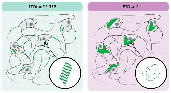FTDtau1+2-GFP and FTDtau1+2 tau form structurally and morphologically distinct pathological tau assemblies that differentially affect GVB accumulation. Schematic overview of the results: The FTDtau1+2-GFP tau pathology model results in densely packed, parallel tau filaments (in green), which are present in both the neuronal soma and neurites. Tau pathology in the FTDtau1+2 model is more evenly distributed within neuronal somata and presents a less organized filament ultrastructure. In addition, the FTDtau1+2 filaments are thinner and shorter than the FTDtau1+2-GFP filaments. The GVB load (in magenta) in the FTDtau1+2 model is approximately 10-fold higher than in the FTDtau1+2-GFP model.