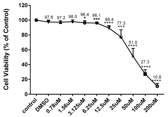 Effect of CD on the cell viability of BV-2 cells. Cell viability was evaluated using resazurin dye (7-hydroxy-3H-phenoxazin-3-one 10-oxide) 24 h after treatment. The data are presented as mean ± SEM and the significance of differences from the control treatment was determined using a one-way ANOVA and Dunnett’s multiple comparison tests. * p ≤ 0.05, *** p ≤ 0.001, **** p ≤ 0.0001.