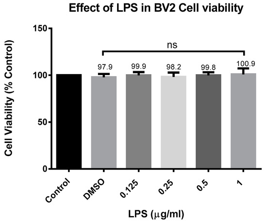 Effect of LPS on the cell viability of BV-2 cells. Cell viability was evaluated using resazurin dye (7-hydroxy-3H-phenoxazin-3-one 10-oxide) 24 h after treatment. The concentration of 1 µg/mL was used for further experiments. The data are presented as mean ± SEM and the significance of differences from DMSO treatment was determined using a one-way ANOVA and Dunnett’s multiple comparison tests. ns = nonsignificant.
