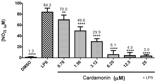 Effect of CD on nitric oxide production in LPS-activated BV-2 microglial cells. CD concentrations ranging from 0.78 µM to 25 µM were used. Nitric oxide production was measured using Griess reagent (1% sulfanilamide, 0.1% N-(1-naphthyl)-ethylenediamine hydrochloride in 5% phosphoric acid (H3PO4)) 24 h after treatment. The data are presented as mean ± SEM and the significance of differences from LPS treatment was determined using a one-way ANOVA and Dunnett’s multiple comparison tests. ** p ≤ 0.01, **** p ≤ 0.0001.