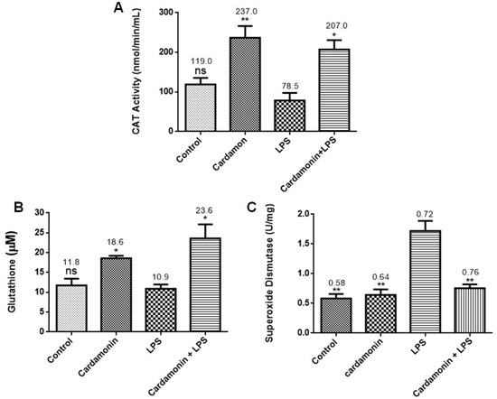 Effect of CD on the levels of CAT (A), GSH (B) and SOD (C) in BV-2 microglial cells. LPS 1 µg/mL stimulated the cells for 24 h. The data are presented as mean ± SEM and the significance of differences from LPS treatment was determined using a one-way ANOVA and Dunnett’s multiple comparison tests. * p ≤ 0.05, ** p ≤ 0.01, ns = nonsignificant.