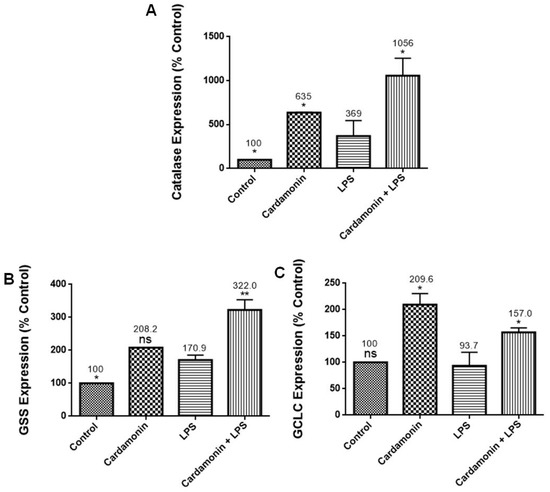 Effect of CD on the mRNA expression of CAT (A), GSS (B) and GCLC (C). The BV-2 microglial cells were stimulated with LPS 1 µg/mL for 24 h. The data are presented as mean ± SEM and the significance of differences from LPS treatment was determined using a one-way ANOVA and Dunnett’s multiple comparison tests. * p ≤ 0.05, ** p ≤ 0.01, ns = nonsignificant.