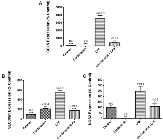 Effect of CD on the mRNA expression of CCL5/RANTES (A), SLC38a1 (B) and NOS2 (C). The BV-2 microglial cells were stimulated with LPS 1 µg/mL for 24 h. The data are presented as mean ± SEM and the significance of differences from LPS treatment was determined using a one-way ANOVA and Dunnett’s multiple comparison tests. * p ≤ 0.05, ** p ≤ 0.01, *** p ≤ 0.001.