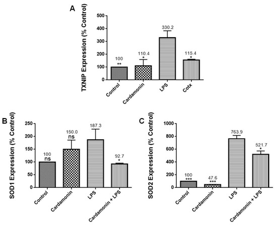 The effects of CD on the mRNA expression of TXNIP (A), SOD1 (B) and SOD2 (C). The BV-2 microglial cells were stimulated with LPS 1 µg/mL for 24 h. The data are presented as mean ± SEM and the significance of differences from LPS treatment was determined using a one-way ANOVA and Dunnett’s multiple comparison tests. * p ≤ 0.05, ** p ≤ 0.01, *** p ≤ 0.001, ns = nonsignificant.