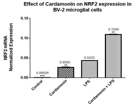 The effects of CD on the mRNA normalized expression of Nrf2. The BV-2 microglial cells were stimulated with LPS 1 µg/mL for 24 h. The data are presented as mean ± SEM and the statistical significance of the difference between LPS and different treatments was determined using a one-way ANOVA, followed by Dunnett’s multiple comparison tests ** p ≤ 0.01, *** p ≤ 0.001.