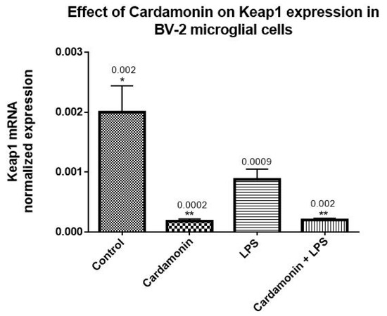 The effects of CD on the mRNA normalized expression of Keap1. The BV-2 microglial cells were stimulated with LPS 1 µg/mL for 24 h. The data are presented as mean ± SEM and the significance of the difference between LPS and different treatments was determined using a one-way ANOVA, followed by Dunnett’s multiple comparison tests. * p ≤ 0.05, ** p ≤ 0.01.