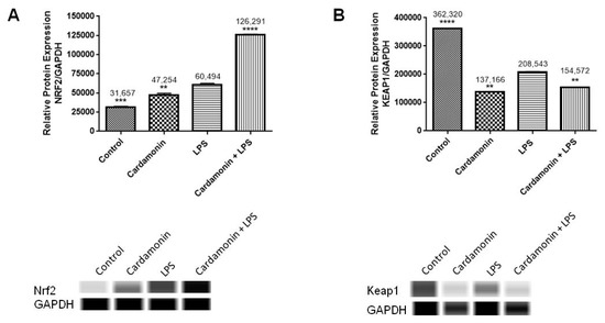 Specific antibodies for Nrf2 and Keap1 were used to validate the PCR results at the protein level. Results showed that CD treatment increased the levels of Nrf2 protein expression compared to the control. When the CD treatment was followed by LPS stimulation after 1 h, there was an even higher increase in Nrf2 protein expression levels (Figure 10). On the other hand, CD had the opposite effect on the expression of the Keap1 protein, reducing the levels observed in the control. The same was observed when CD and LPS were combined (Figure 10). These data validate the findings of the CD effect on the transcription level.