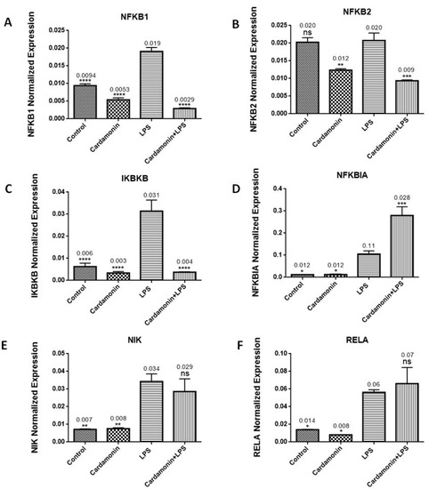 The effect of CD on the expression of genes involved in the NFkB signaling pathway: NF-κB1 (A), NF-κB2 (B), IKBκB (C), NFκBIA (D), NIK (E) and RELA (F). Graph bars show control, CD (6.25 µM), LPS and CD cotreatment (CD (1 h before) + LPS. Data represent normalized expression as the mean ± SEM, the statistical significance of the difference between LPS and different treatments was determined using a one-way ANOVA and Dunnett’s multiple comparison tests. * p ≤ 0.05, ** p ≤ 0.01 *** p ≤ 0.001, **** p ≤ 0.0001, ns = nonsignificant.