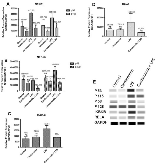 The effect of CD on the expression of proteins involved in the NF-kB signaling pathway: NF-κB1 (A), NF-κB2 (B), IKBκB (C), RELA (D) and bands (E) representing the protein expression after four treatments (24 h). Graph bars show control, CD (6.25 µM), LPS and CD cotreatment (CD 1 h before) + LPS. Data representing protein expression as the mean ± SEM and the statistical significance of the difference between LPS and different treatments were determined using a one-way ANOVA and Dunnett’s multiple comparison tests. * p ≤0.05, ** p ≤ 0.01, ns = nonsignificant.