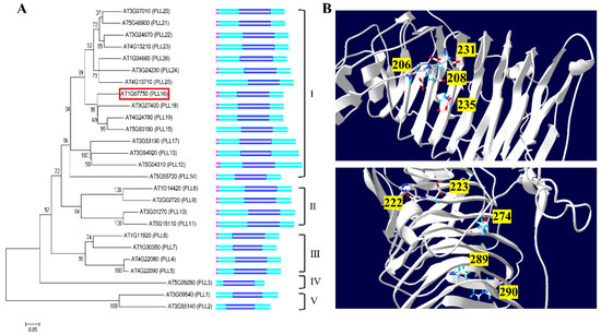 Phylogenetics and structure analysis of PLLs in Arabidopsis. (A) Phylogenetic tree and protein structure of AtPLLs. The phylogenetic tree was constructed by the neighbor-joining method with 1000 bootstrap replications using MEGA 5 software, and the alignment of the AtPLL protein sequences was performed using ClustalW. The numbers on the nodes indicate clade credibility values. AtPLL16 is highlighted with a red box. The protein structure of AtPLLs, constructed using IBS 1.0 software. The Pec_lyase_C domain is indicated with dark blue. The pink domain represents the predicted signal peptide. Clusters I–V on the right side indicate different clusters of PLL proteins according to Sun et al. 2010 [23]. (B) Tertiary structures of the AtPLL16 protein, predicted using the SWISS-MODEL online tool (http://swissmodel.expasy.org/interactive/, accessed on 10 March 2021). The numbers indicate four Ca++ binding sites (above) and five substrate binding sites (below).