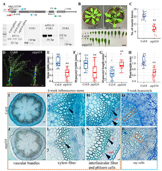 The atpll16 mutant had vascular developmental defects. (A) The illustration for the T-DNA insertion of AtPLL16 and RT-PCR results for AtPLL16. The triangle shows the insertion position and the lines on triangles represent the insertion direction. The arrows show three pairs of primers in the upper part. The results for the three pairs of primers are presented below, one spanning the T-DNA insertion site, the second corresponding to the middle part of the transcript, and the third corresponding to the 3′-part of the transcript. Col.0 gDNA and Col.0 cDNA were used as controls, Ef1-α was used as the reference gene in RT-PCR, and the DNA ladder is shown on the left in the lower part. (B) The 32-day-old Arabidopsis plants. (C) The numbers of rosette leaves from plants in (B). (D) The 8-week-old Arabidopsis plants. (E–H) Stem width (E), hypocotyl width (F), hypocotyl length (G), and plant height (H) of the atpll16 mutant and wild type (Col.0) from (D), respectively. (I,J) Basal stem cross-section of the wild type and atpll16 mutant; the atpll16 mutant had fewer vascular bundles. Scale bar, 100 μm. (K,L) Zoom-in of the interfascicular bundle region of the wild type and the atpll16 mutant. Arrows show xylem fibers. Scale bar, 20 μm. (M,N) Comparison of interfascicular phloem fiber cells of the wild type and the atpll16 mutant. Arrows indicate phloem cells and interfascicular fiber cells. Scale bar, 20 μm. (O,P) Hypocotyl cross-section of the wild type and the atpll16 mutant. Orange boxes show ray cells. Scale bar, 50 μm. Sample size n = 16, ‘**’ indicates a significant difference at p < 0.01 by Student’s t-test. Bar = 2 cm in (B,D).