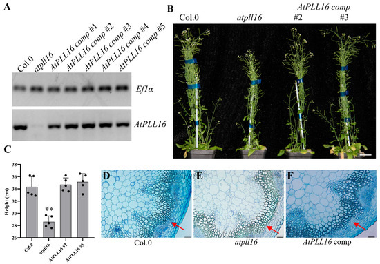 Complementation analysis of AtPLL16 in the Arabidopsis atpll16 mutants. (A) Characterization of the AtPLL16 expression level in AtPLL16 complementation transgenic lines. Ef1-α was used as the reference gene in RT-PCR. (B) Left to right, 8-week-old Col.0, atpll16, AtPLL16 comp #2, and AtPLL16 comp #3 plants. Bar = 5 cm. (C) Height of the plants in (B). Sample size n = 5, ‘**’ indicates significant differences at p < 0.01 by Student’s t-test. (D–F) Cross-sections of base inflorescence stems from 6-week-old Col.0 (D), atpll16 (E), and AtPLL16 comp #2 (F), representative. Bars = 50 µm. Red arrows represent phloem fibers.