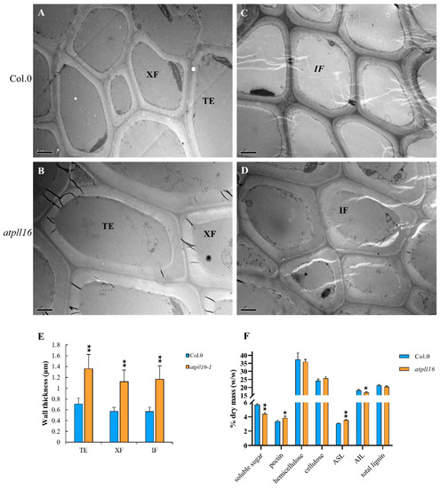 We further determined the thickness of secondary walls from tracheary element (TE) cells, xylem fibers (XF), and interfascicular fibers (IF) using electro-scanning microscopy (Figure 4). In all three cell types, the thickness of the secondary cell wall from the atpll16 mutant was almost twice as thick as that from the wild type (Figure 4A,B for TE and XF, C and D for IF cells, E). The wall polymer composition was determined using basal stem internodes from wild-type and atpll16 mutant plants (Figure 4F). No significant difference could be observed in the content of cellulose, hemicellulose, or total lignin, but the level of soluble sugar was reduced in the atpll16 mutant, concomitantly with a slight but significant increase in pectin (Figure 4F). Although the total lignin level was not affected, the level of acid-soluble lignin (ASL) was slightly increased in the atpll16 mutant, and the opposite occurred for acid-insoluble lignin (AIL) (Figure 4F). Given the function of PLL proteins in pectin degradation, we would expect an increase in pectin in the knock-out mutant of PLL genes (Figure 4F), which was indeed the case. The change in pectin content was not as dramatic, possibly due to a redundant function of other PLL genes.