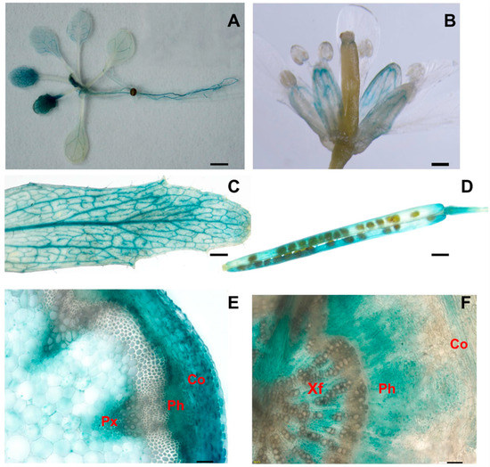 Promoter-GUS activity showing AtPLL16 tissue-specific expression. (A) A 2-week-old seedling. (B) Floral organs. (C) Mature rosette leaf. (D) Silique. (E) Basal stem cross-section of 6-week-old plants. (F) Hypocotyl cross-section of 6-week-old plants. Co, cortex; Ph, phloem; Px, primary xylem; Xf, xylem fibers; (A–D) Bars = 1 mm; (E,F) Bars = 50 µm.