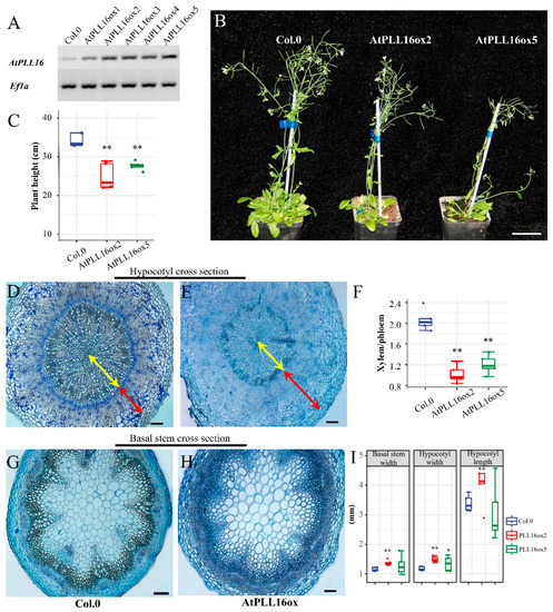 AtPLL16 overexpression causes a dramatic change in the xylem–phloem ratio. (A) AtPLL16 expression in transgenic plant leaves by RT-PCR, Ef1-a as the reference gene. (B,C) AtPLL16ox has a lower plant height at the mature stage (8 weeks old). Sample size n = 5, bar = 5 cm. (D,E) Hypocotyl cross-section of wild-type and AtPLL16ox plants (6 weeks old). Yellow arrows indicate xylem and red arrows indicate phloem. Scale bar, 100 μm. (F) Xylem–phloem width ratio of wild-type and AtPLL16ox plants. Sample size n = 5. (G,H) Basal stem cross-section of wild-type and AtPLL16ox plants. Scale bar, 100 μm. (I) Basal stem width, hypocotyl width, and hypocotyl length of wild-type and AtPLL16ox plants. Sample size n = 5. ‘*’ and ‘**’ indicate a significant difference at p ≤ 0.05 and p ≤ 0.01 by Student’s t-test.