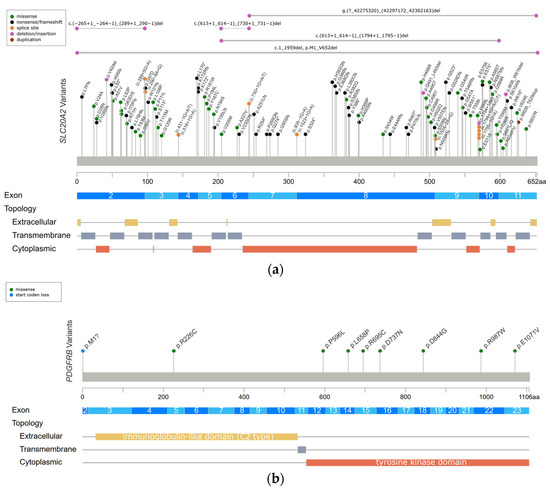 The PDGFB gene was also reported in 2013 [8], and it is located on chromosome 22 and encodes for the PDGF-B precursor protein. This precursor protein is cleaved at positions 81 and 191, and subsequently forms a homodimer through disulfide bonds, which is the main ligand of PDGF-Rβ [16]. The PDGFB gene is expressed in neurons and endothelial cells in the brain [8]. PDGF-B is a growth factor for mesenchymal cells and plays a crucial role in the proliferation and recruitment of pericytes and vascular SMCs. [44,45]. Heterozygous variants in the PDGFB gene have been identified in 12% of genetically confirmed PFBC patients [3]. The missense change is the most common variant type in the PDGFB gene, followed by nonsense, splice site, and extension variants. The variants cluster between protein positions 82 and 190, which are retained in the mature PDGF-B protein (Figure 1c) [3,8,17,56,59,69,82,97,98,99,100,101,102,103,104,105]. The same as PDGFRB does, PDGFB variants also cause haploinsufficiency, either by deleting critical parts of protein or disrupting normal protein function. The loss of normal PDGF-B function leads to BBB impairment via PDGF-Rβ, and then triggers the process of calcification [2,8].
