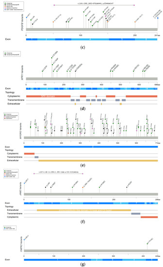 Reported variants in seven genes linked to PFBC along the protein sequence and their topologic protein models. (a) The reported variants in the SLC20A2 gene and topology protein model of PiT2. (b) PDGFRB gene and PDGF-Rβ. (c) PDGFB gene. (d) XPR1 gene and XPR1. (e) MYORG gene and MYORG. (f) JAM2 gene and JAM2. (g) CMPK2 gene. There is no obvious hotspot for SLC20A2, MYORG, and JAM2 genes. The variants tend to cluster in the tyrosine kinase domain of the PDGFRB gene, the mature protein product between positions 82 and 190 of the PDGFB gene, and in the SPX domain of the XPR1 gene. Meaning of symbols: *, stop codon; ?, unknown (a variant affecting the initiation codon cannot be predicted).