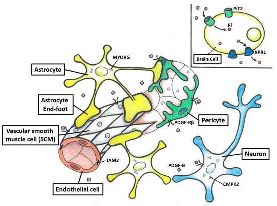 In conclusion, three potential mechanisms underlying the pathogenesis of PFBC have been proposed. The first mechanism is the disturbance of the homeostasis of phosphate, which is supported by the transporter function of SLC20A2 and XPR1. The second mechanism is the disruption of the NVU. The NVU is composed of neurons, astrocytes, vascular SMCs, pericytes, and endothelial cells (Figure 2). Each element of the NVU interacts tightly with the others, which leads to an effective system used to regulate cerebral blood flow and maintain BBB integrity [119,120]. This is supported by the observation that PDGFRB, PDGFB, MYORG, and JAM2 are highly expressed in the composite cells of the NVU. However, the exact mechanism of how NVU dysfunction causes brain calcification remains to be elucidated [10,11,12]. The third mechanism is the impairment of mitochondrial function. This hypothesis is supported by research on CMPK2, which plays a significant role in the salvage pathway in the mitochondria [13]. Interestingly, some connections between these three mechanisms have also been proposed. First, intracellular calcification in Slc20a2−/− mice has been shown to be mainly distributed in NVU cells, such as the pericytes and astrocytes [87]. Second, the co-localization of XPR1 and PDGFRB has been reported, and they may form a complex on the cell membrane [46]. Third, CMPK2 is highly expressed in neurons and vascular endothelial cells, and the latter ones are also part of the NVU [13]. Taken together, the homeostasis of phosphate and maintaining mitochondrial function in NVU cells appear to play important roles in the pathogenesis of PFBC [12,13]. Further functional studies are needed to elucidate the detailed mechanisms.