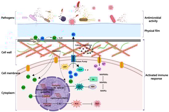 Illustration of the three tiers of protection provided by copper-based antimicrobial compounds. The spatial defense network consists of a physical film, antimicrobial activity, and activation of immune responses. ABA, abscisic acid; AO, ascorbate oxidase; ET, ethylene; ROS, reactive oxygen species; SA, salicylic acid. The picture was drawn using the MedPeer software (https://user.medpeer.cn/ (6 February 2023)).