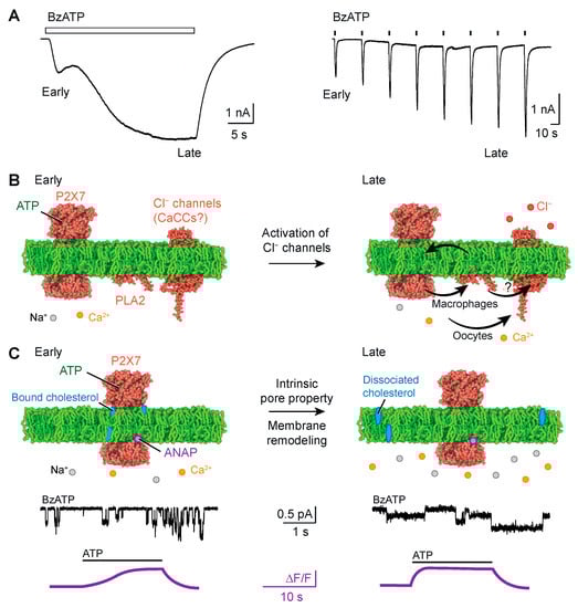 Several mechanisms have been proposed to explain current facilitation in P2X7. Initially, the pore dilation theory was postulated, suggesting that current facilitation resulted from the dilation of the ion channel pore, which was also proposed to explain macropore formation [,]. However, upon closer examination, it has been found that the interpretation of the data supporting the pore dilation theory was deemed unsatisfactory (see next chapter) []. Subsequently, new mechanistic insights have emerged. Here, we summarized these findings into two comprehensive models, as depicted in Figure 2B,C.