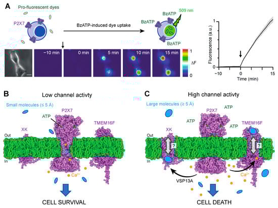 Another recent study has identified a scramblase called XK, which, together with the cytosolic lipid transporter VPS13A, acts as a prerequisite for P2X7-mediated phospholipid scrambling and cell lysis in mouse T cells []. The XK-VSP13A complex forms a protein complex at the plasma membrane, and upon P2X7 activation by ATP binding, it induces phospholipid scrambling, resulting in a novel form of necrosis [,].