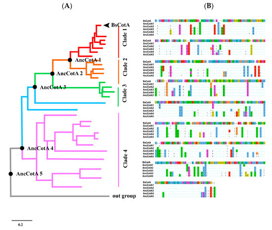 (A) Phylogenetic tree of BsCotA. Lineages are colored according to sequence similarity (from top to bottom, 90–100%, 70–80%, 60–70%, and 55–60%). The ancestor sequences are marked with black dots (from top to bottom, AncCotA1, 2, 3, 4, and 5). The black arrow refers to BsCotA. (B) Alignment of the five BsCotA variants and the inferred CotA variants. The BsCotA sequence is shown in the head, the residues that differ from BsCotA are highlighted, and the consensus sequence is shown as dots, the amino acids are coloured in clustal colour scheme.