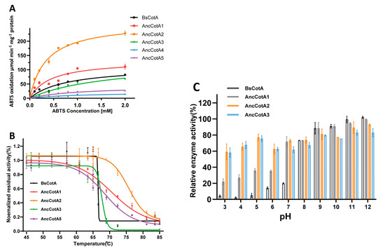 The kinetic parameters of the wild-type BsCotA and the inferred variants were investigated using ABTS as the substrate (Table 1 and Figure 2A). Notably, compared with the wildtype BsCotA, AncCotA2 exhibited a kcat/KM value of 7.52 × 105 M−1·s−1, which led to a 5.22-fold improvement compared to the wildtype BsCotA.