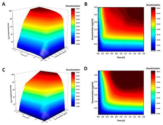 Indigo carmine decolorization within 2 h of incubation with BsCotA and mutant (AncCotA2) shown with 3D surfaces and contour plots. (A) 3D surface plot of indigo decolorization rate of BsCotA. (B) Contour plot of indigo decolorization rate of BsCotA. (C) 3D surface plot of indigo decolorization rate of AncCotA2. (D) Contour plot of indigo decolorization rate of AncCotA2.