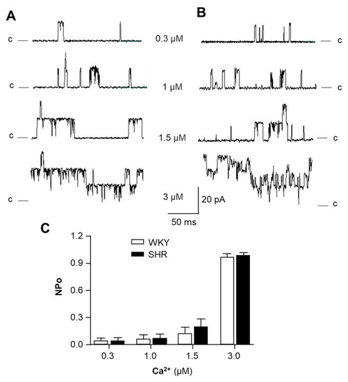 Previous studies have demonstrated that reduced BKCa channel activity contributes to vascular hypercontractility and remodeling in hypertension [7]. Therefore, we examined the possibility that the dysfunction of BKCa channels is due to altered Ca2+-sensitivity in VSMCs of SHR. Single BKCa channel recording was performed using patch clamp in VSMCs dissociated from mesenteric arteries of SHR and WKY rats, as described in the Methods. BKCa channel currents were recorded from inside-out patches of VSMCs bathed with different Ca2+ concentrations from 0.3 to 3 µM. The results are presented in Figure 1, demonstrating that Ca2+ in the bath solution did not alter the unitary amplitude of single-channel currents (Figure 1A,B) at concentrations from 0.3 to 3.0 μM in VSMCs from both SHR and WKY rats. However, the open probability of the BKCa channel was significantly increased by Ca2+ in a concentration-dependent manner in VSMCs from both strains of rats (Figure 1C). More interestingly, the channel activity at each Ca2+ concentration was comparable between SHR and WKY rats (Figure 1C). Taken together, the results from this experiment indicate that BKCa activity is stimulated by intracellular Ca2+ and that the Ca2+-sensitivity of BKCa is not significantly altered in VSMCs of SHR as compared with WKY rats.