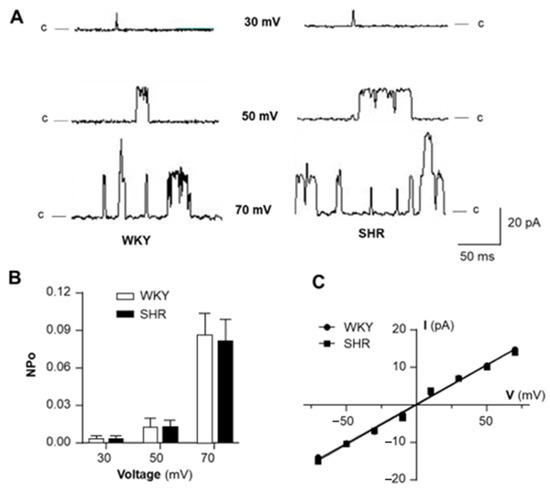 In the next experiment, we examined the possibility that the dysfunction of BKCa channels is caused by altered voltage-sensitivity in VSMCs of SHR. Single BKCa channel currents were recorded on inside-out patches of VSMCs at different membrane potentials from −70 mV to +70 mV. The results are presented in Figure 2, demonstrating that the amplitude of the BKCa channel current was membrane potential-dependent (Figure 2A). The conductance of BKCa channels was 210 ± 2 pS and 211 ± 3 pS in VSMCs from WKY and SHR, respectively (Figure 2C). The channel open-state probability (NPo) was increased by membrane depolarization (Figure 2A,B). More interestingly, both channel open probability and conductance at each membrane potential were comparable in VSMCs from SHR and WKY rats. In summary, these data demonstrate that the voltage-sensitivity of the BKCa channel in VSMCs is not significantly altered in SHR as compared with WKY rats.