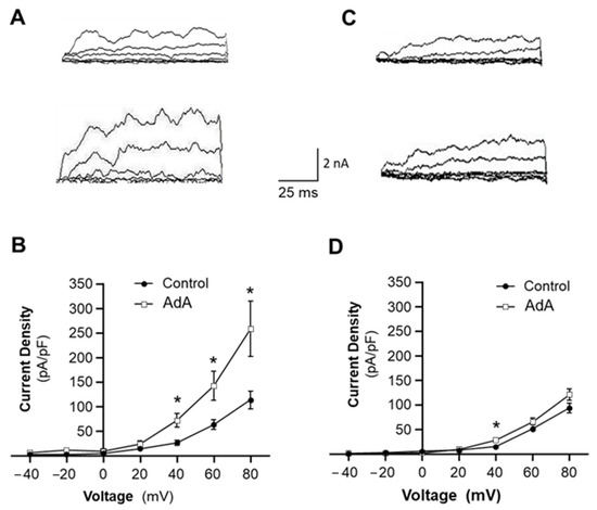 Recently, inositol 1,4,5-trisphosphate receptors (IP3Rs) have been identified in the sarcoplasmic reticulum (SR, an intracellular Ca2+ store) mediating Ca2+ release from SR after cellular exposure to vasoactive agonists, such as NE and Ang II [14,15,16]. Considering that the activity of BKCa is regulated by intracellular Ca2+, BKCa channel activity could be maintained by Ca2+ released from SR through IP3R. This hypothesis was tested in VSMCs isolated from mesenteric arteries using the whole-cell recording configuration, as described in the Methods. Whole-cell BKCa currents were recorded from VSMCs before and after treatment with the IP3R agonist, Adenophostin A (AdA, 1 µM). AdA is a hydrophilic compound, not cell-permeable. Therefore, AdA was encapsulated into liposomes as a vehicle for delivery into cells. The drug-delivery liposome preparation has been characterized using fluorescence in our previous study [17]. The results are presented in Figure 3, demonstrating that treatment of VSMCs from WKY rats with AdA significantly increased BKCa channel density from 62.8 ± 9.6 pA/pF to 142.3 ± 30.0 pA/pF at +60 mV holding potential (n = 9 cells, p < 0.05; Figure 3A,B). In addition, the liposome vehicle did not significantly alter BKCa channel currents. This result indicates that the BKCa channel is activated by an IP3R agonist, likely through Ca2+ release, suggesting the functional coupling of IP3R-BKCa in VSMCs of WKY rats.