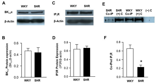 In the next experiment, BKCa antibodies were used to pull down BKCa protein, some of which could be associated with IP3R, in mesenteric artery samples from SHR and WKY rats. IP3R protein levels in the immunoprecipitated samples were detected using standard Western blots with IP3R1-specific antibodies. The results are presented in Figure 4E,F, indicating that IP3R protein levels in the positive control (the corresponding original samples without co-immunoprecipitation) are comparable between SHR and WKY rats. However, the co-immunoprecipitated sample from WKY rats generated a stronger band as compared with immunoprecipitated samples from SHR (Figure 4E). The negative control lane did not generate any band, as expected, since the negative control sample contained empty beads. Taken together, all results strongly imply that the protein levels of BKCa and IP3R are not altered in mesenteric arteries of SHR, but the molecular coupling between BKCa and IP3R is disrupted in mesenteric arteries of SHR, as compared with normotensive WKY rats.