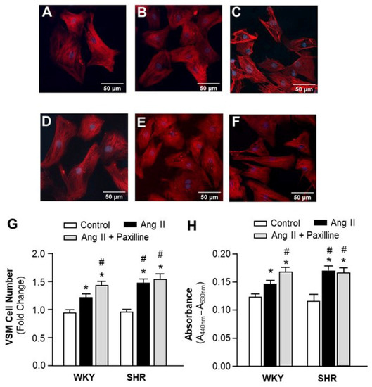 Effect of BKCa blockade on Ang II-induced proliferation in VSMCs from hypertensive versus normotensive rats. The VSMCs were cultured from mesenteric arteries of SHR and WKY rats. (A–F) Representative fluorescence micrographs of cells stained with smooth muscle-specific α-actin antibodies after being treated with the control, Ang II (0.1 µM), or Ang II plus paxilline (1 µM) in VSMC cultures of WKY rats (A–C) and SHR (D–F). (G) Bar graphs summarizing the VSMC number changes after treatment with the control, Ang II (0.1 µM), and Ang II plus paxilline (1 µM) for 24 hrs. Data are mean ± SE, derived from three experiments and at least triplicate wells in each experiment. * p < 0.05 as compared with relative control. # p < 0.05 as compared with WKY Ang II. (H). Bar graphs summarizing the cell proliferation measured using WST-1 in VSMCs after treatment as described in the above. Data are mean ± SE, derived from three experiments and at least triplicate wells in each experiment. * p < 0.05 as compared with control. # p < 0.05 as compared with WKY Ang II.
