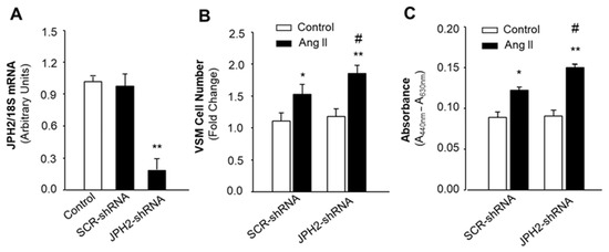 Effect of JPH2 knockdown on Ang II-induced VSMC proliferation. VSMCs were cultured from mesenteric arteries of WKY rats. The cells were treated with saline, AAV2-JPH2-shRNA, or its scramble control (AAV2-SCR-shRNA). (A) Bar graphs summarizing JPH2 mRNA levels in VSMCs treated with the control (PBS), AAV2-SCR-shRNA, or AAV2-JPH2-shRNA. Data are mean ± SE, derived from three experiments and triplicate wells in each experiment. ** p < 0.01 as compared with PBS control. (B) Bar graphs summarizing the change in cell number of VSMCs treated with PBS or Ang II after incubation with AAV2-JPH2-shRNA or AAV2-SCR-shRNA. Data are mean ± SE, derived from three experiments and at least triplicate wells in each experiment. * p < 0.05 as compared with relative control. ** p < 0.01 as compared with relative control. # p < 0.05 as compared with Ang II plus AAV2-SCR-shRNA. (C) Bar graphs summarizing the proliferation of VSMCs treated with PBS or Ang II after incubation with AAV2-JPH2-shRNA or AAV2-SCR-shRNA. Data are mean ± SE, derived from three experiments and at least triplicate wells in each experiment. * p < 0.05 as compared with relative control. ** p < 0.01 as compared with relative control. # p < 0.05 as compared with Ang II plus AAV2-SCR-shRNA.
