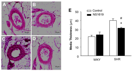 SHR and WKY rats were used to examine the effect of a BKCa channel opener on vascular remodeling. The BKCa channel opener, NS1619 (20 µg/kg/day), was administered chronically by subcutaneous infusion via osmotic minipumps (ALZET, Model 2004). The minipump implantation was performed as described in our previous publication [27]. After chronic treatment with vehicle control or NS1619 (20 µg/kg/day) for 4 weeks, SHR and WKY rats were euthanized with overdoses of pentobarbital. The mesentery was isolated and cross-sectioned using a Cryostat (Leica Biosystems). The mesenteric artery sections were fixed in 4% formalin/PBS, followed by staining with hematoxylin and eosin (H&E), as described in our previous publication [27]. The vascular morphology was visualized by a microscope (Olympus, Shinjuku City, Japan). Vascular wall thickness was measured with Infinity Capture and Analysis Software (v6.5.6) to evaluate vascular hypertrophy. The external diameter of the arteries measured was 100–150 µm in all arterial cross-sections.