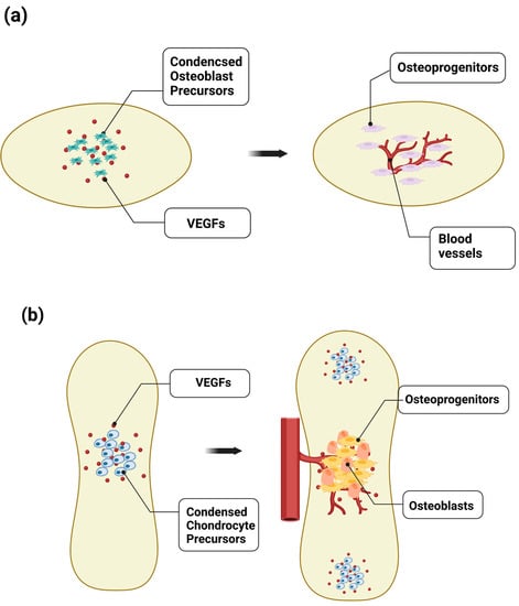 In both processes of ossification, vascular invasion and blood vessel growth into the mesenchymal condensate are important later events in bone development through the expression of VEGF, which enhances osteogenesis and supports vascular patterning during bone development [