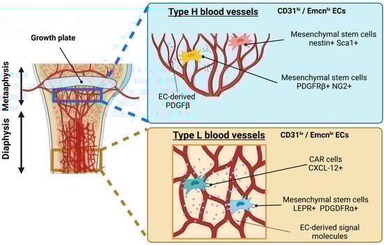 Figure 3). In the diaphyseal region, sinusoidal type L vessels are associated with mesenchymal stem cells expressing leptin receptor (LEPR) and PDGFRα [