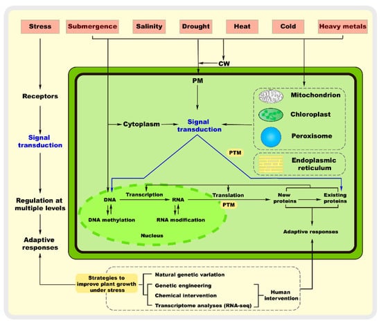 Plant resistance to abiotic stresses at the molecular level through sensing mechanisms and genetic responses. Abiotic stress can be perceived in different cellular compartments, including the cell wall (CW), plasma membrane (PM), cytoplasm, mitochondria, chloroplasts, peroxisomes, endoplasmic reticulum, and nucleus, leading to the initiation of molecular responses. These stress sensors then transmit the signals downstream through secondary messengers and regulatory proteins, such as Ca2+, ROS, and protein kinases. Furthermore, it is now well known that abiotic stress induces different responses involving stress sensing, signal transduction, and regulation at multiple levels. Therefore, plants have evolved mechanisms to adjust their growth to survive and reproduce under stress. PTM: post-translational modifications.