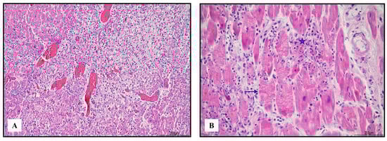 Severe lympho-histiocytic myocarditis (hematoxylin and eosin). Areas of damaged myocardium were diffuse and involved both ventricles and the septum ((A) 4 HPF). In those zones, necrosis (blue star) and contraction bands (blue arrow) were well represented ((B) 40 HPF).