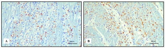 Immunohistochemistry of lympho-histiocytic myocarditis. Abundance of TCD3+ lymphocytes ((A) 20 HPF) and CD68 PGM1+ macrophages ((B) 20 HPF).