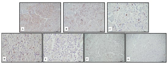 Immunohistochemical characterization of the lymphocytic inflammatory response in myocarditis. TCD4+ cells ((A) 10 HPF) were rare compared with TCD8+ ((B) 10 HPF), but there was a cross reaction with macrophages, and the darker brown cells were lymphocytes. TCD8+ cytotoxic cells were Tia-1+ ((C) 40 HPF) and PD-1+ ((D) 40 HPF), but Granzyme B negative ((E) 40 HPF). TCD25+ regulatory T cells were abundant ((F) 10 HPF), intermixed with rare BCD20+ lymphocytes ((G) 10 HPF). Scale bar: 200 μm.